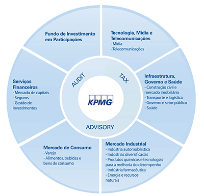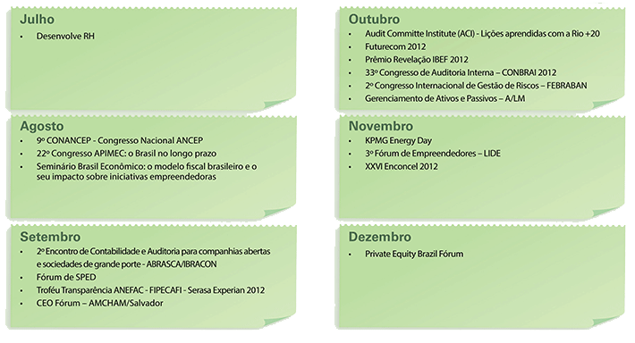 Associação Brasileira de Atacadistas e Distribuidores (ABAD): associação e participação em eventos. Associação Brasileira de Direito Financeiro – ABDF/RJ Associação e participação em eventos. Associação Brasileira de Recursos Humanos – ABRH/RJ Associação e participação em eventos. Associação Brasileira de Private e Venture Capital –ABVCAP/ SP e RJ: Associação e participação em eventos. Associação Comercial do Rio de Janeiro (ACRJ): associação e participação em eventos. Associação dos Analistas e Profissionais de Investimento do Mercado de Capitais – Apimec/SP Associação e participação em eventos e composição da mesa diretora. Associação Brasileira das Companhias Abertas – Abrasca/ SP e RJ Associação e participação em eventos. José Gilberto M.Munhoz (sócio da KPMG) é membro da CANC - Comissão de Auditoria e Normas Contábeis e representante junto à Abrasca. Manuel Fernandes e Roberto Cunha (sócios da KPMG) também participam como membros da CANC e Rodrigo Uchoa é membro da COJUR – Comissão Jurídica. Associação Comercial e Industrial de Campo Grande –ACICG Associação e participação em eventos. Câmara Britânica de Comércio e Indústria no Brasil – Britcham/SP e RJ Associação e participação em eventos. David Bunce (sócio de Advisory/T&R da KPMG) integra o Conselho da entidade e atualmente é o Chairman da Britcham. Fabiana Veloso Pereira (sócia-diretora da KPMG) é membro do Comitê Legal, Roberto Haddad (sócio da KPMG) é membro do Comitê Tributário e Stephen Rimmer (sócio da KPMG) é coordenador do Comitê do Comércio. Câmara de Comércio Brasil-Alemanha – AHK/SP, RJ e Porto Alegre Associação, participação em eventos, permuta e ações de marketing. Na AHK de São Paulo, um profissional da KPMG integra o Grupo de Trabalho (GT) de Marketing. Leslie Laurenti (sócia-diretora da KPMG) é responsável pela auditoria da Câmara e Charles Krieck (sócio da KPMG) é membro da diretoria. Em Porto Alegre, Wladimir Omiechuk (sócio da KPMG) é membro do Conselho Empresarial. Câmara de Comércio Americana – Amcham Brasil Iêda Novais (sócia-diretora da KPMG) é membro do Conselho de Administração, do Comitê Executivo e presidente do Comitê de Sustentabilidade. Câmara de Comércio Americana - Amcham/ Belo Horizonte, Brasília, Campinas, Curitiba, Goiânia, Porto Alegre, Recife, Ribeirão Preto, Rio de Janeiro, Salvador, São Paulo e Uberlândia Associação, participação em eventos e comitês. Ao todo, 10 profissionais da KPMG integram diversos Comitês Estratégicos nos temas de Energia, Business Affairs, Economia e Finanças, Comércio Exterior, Tributos, Sustentabilidade, entre outros. Jaime Cervatti (COO da KPMG) é membro do Conselho Amcham Curitiba e Manuel Fernandes (sócio da KPMG) é diretor da Amcham Rio de Janeiro. Câmara de Comércio e Indústria Japonesa do Brasil– SP Participação em eventos. FujiiToshiharu (sócio de Audit e líder de Japanese Desk da KPMG) é membro do Conselho Fiscal. Câmara de Comércio Holando Brasileira – Dutcham Participação em eventos. Alexandre Fujimoto (sócio-diretor de Audit da KPMG) é membro do Conselho Consultivo Câmara Portuguesa de Comércio no Brasil – CPCB/RJ SP e Salvador Participação em eventos. Na CPCB do Rio de Janeiro, Bernardo Moreira (sócio de Audit da KPMG) é membro titular do Conselho Fiscal. Conselho Regional de Administração (CRA) São Paulo: Associação por profissional. |