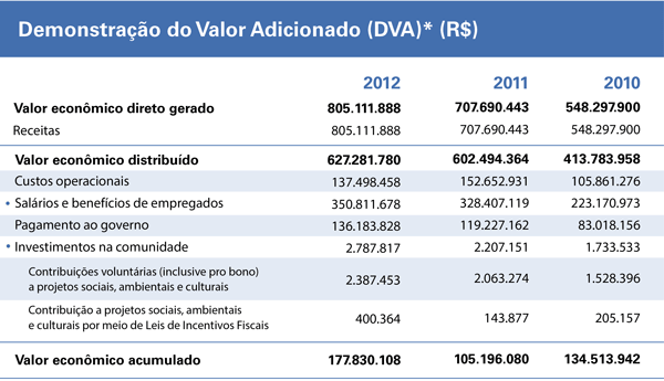O valor gerado à sociedade por meio dos nossos serviços é, por vezes, intangível. Mas como pode ser observado na Demonstração de Valor Adicionado, em 2012, conquistamos um significativo ganho de eficiência nos custos operacionais, ao mesmo tempo em que ampliamos o valor econômico distribuído por meio de salários, impostos e investimentos na comunidade.
