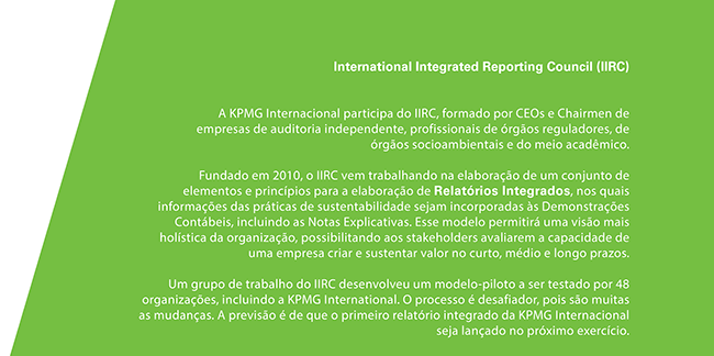 Conselho Regional de Contabilidade (CRC): Associação por profissional. Instituto Brasileiro de Executivos em Finanças – Ibef/São Paulo, Campinas, Curitiba e Rio de Janeiro Participação em eventos, palestras, conselhos e grupos de estudos. No Ibef de São Paulo, Pedro Melo (presidente da KPMG) é membro do Conselho, Marienne Coutinho (sócia de TA X INTL) é líder da Subcomissão de Tributos Internacionais, membro da Comissão de Tributos e do IbefMulher. José Luiz de Carvalho (sócio da KPMG) atua como diretor vogal e Silbert Sasdelli (sócio da KPMG) é responsável pela auditoria do instituto. No Ibef do Rio de Janeiro, Manuel Fernandes (líder do escritório local da KPMG) é membro do Conselho de Administração e Roberto Haddad (sócio da KPMG) é diretor adjunto. Em Campinas, Jarib Fogaça (sócio da KPMG) é membro do Conselho Diretor. Instituto Brasileiro de Governança Corporativa - IBGC/SP, RJ, MG e SulParticipação em eventos. Em SP e RJ, Sidney Ito (sócio da KPMG) é Diretor do IBGC e Claudio Sertório (sócio da KPMG) é coordenador da Comissão de Governança em Instituições Financeiras. No RJ, MG e Sul, Iêda Novais (sócia-diretora da KPMG) é membro do Comitê dos Conselheiros Certificados. Instituto Brasileiro de Petróleo, Gás e Biocombustíveis – IBP/ RJ Participação em eventos. Bernardo Moreira (sócio de Audit da KPMG) é membro da Diretoria. Instituto dos Auditores Independentes do Brasil – IBRACONSP Contribuição com verba fixa. Eduardo Pocetti (sócio da KPMG) ocupa a presidência da Diretoria Nacional e é membro do Conselho de Administração. Pedro Melo (presidente da KPMG) é secretário do Conselho de Administração. Fundação Nacional da Qualidade – FNQ/ SPAssociação e participação em eventos. Iêda Novais (sóciadiretora da KPMG) é membro do Comitê Executivo, do Conselho Curador e do Conselho Fiscal. Elizabeth Fontanelli (sócia-diretora de Marketing na KPMG) é membro do Comitê de Risco. Grupo de Líderes Empresariais de São Paulo - Lide/ São Paulo, Rio de Janeiro e Porto Alegre Participação em eventos e debates. Grupo de Líderes Empresariais (Lide São Paulo, Rio de Janeiro e Sul): participação em eventos e debates. Grupo de Líderes Empresariais para Mulheres (Lidem) São Paulo: Participação em eventos. Movimento Brasil Competitivo: Associação e apoio à mantenedora. FIEP - Federação das Indústrias do Estado do ParanáJaime Cervatti (sócio da KPMG) é membro convidado no Conselho Paranaense de Cidadania Empresarial. Movimento + Mulher 360 Patrícia Molino representa a KPMG na Diretoria e três outras profissionais participam de subcomitês. Junior Achievement BrasilA KPMG é uma das mantenedoras do programa nacional e promove ações de voluntariado corporativo. Pedro Melo (presidente da KPMG no Brasil) é membro do Conselho. Junior Achievement/Rio de JaneiroAssociação e voluntariado corporativo. Manuel Fernandes (sócio líder do escritório KPMG no Rio de Janeiro) é membro da Diretoria. Rede das Mulheres Líderes pela Sustentabilidade – Ministério do Meio AmbienteIêda Novais (sócia-diretora da KPMG) é membro do Conselho Estratégico e Coordenadora do Grupo de Trabalho 1 - Empoderamento da Mulher e Governança Corporativa. |